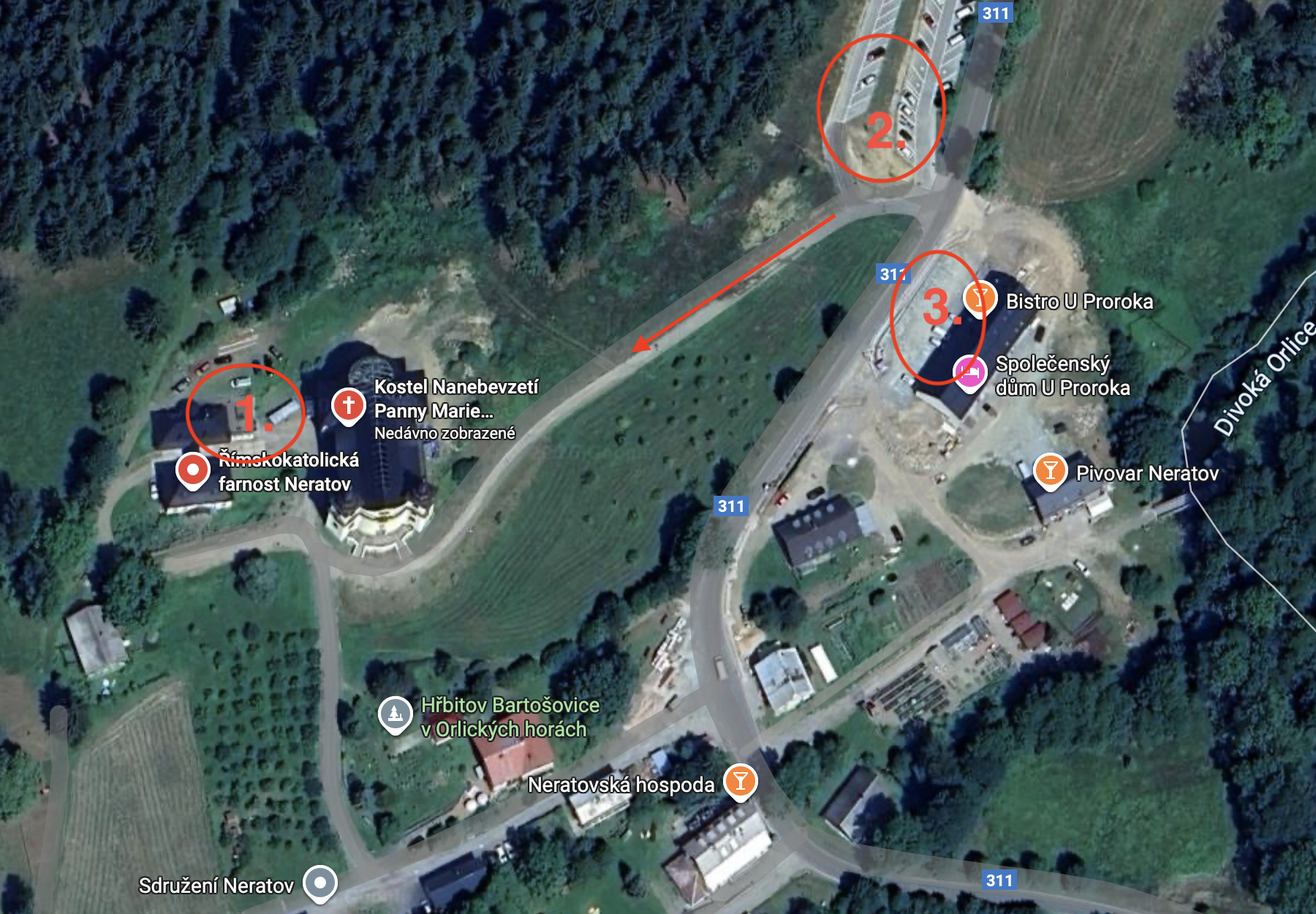 Osobním automobilem. Je možno využít parkování u kostela - č.1, při vjezdu ke kostelu prosím využijte příjezdovou cestou od Nové Vsi (červená šipka), dále oficiální parkování u hlavní cesty č.2, nebo u přilehlého Bistra u Proroka č.3. K orientaci poslouží přiložená mapa.
